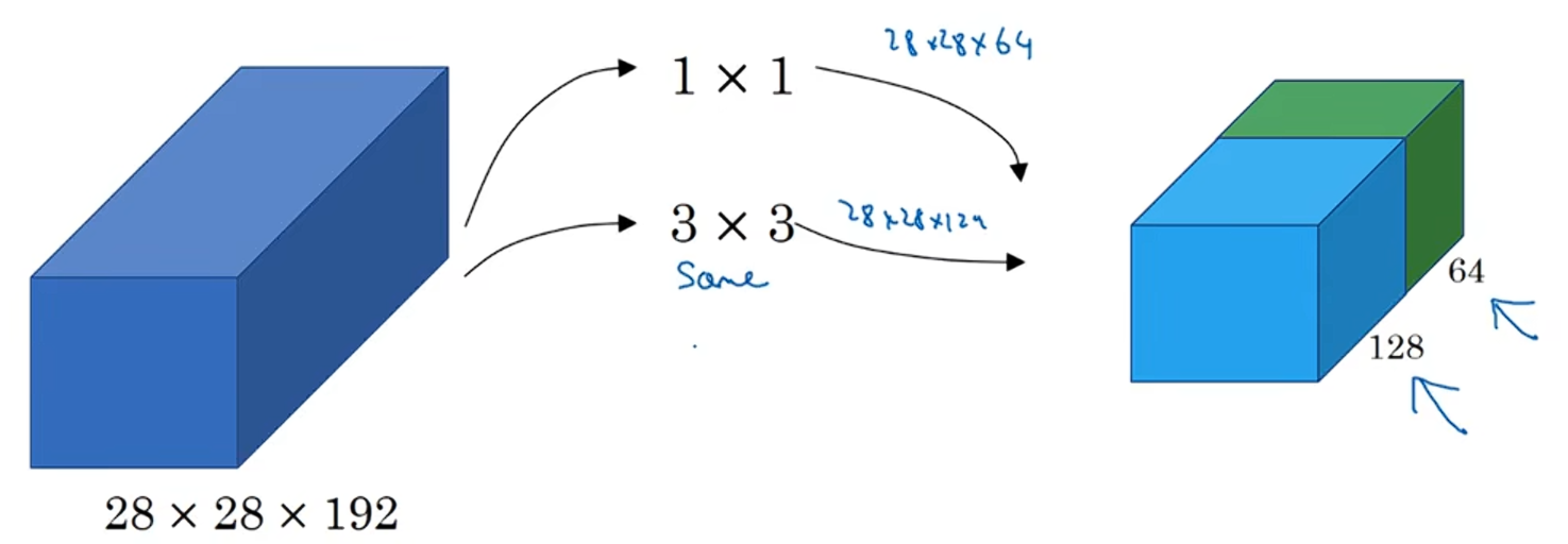 如果你用128个3×3的过滤器,和28×28×192进行Same卷积,那么仍然输出是28×28×128,然后把这个量并列的堆叠在第一个量旁边。