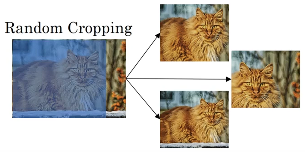 另一种常用技术是随机裁剪,通过随机裁剪,你可以获得不同的示例来扩充你的数据集。