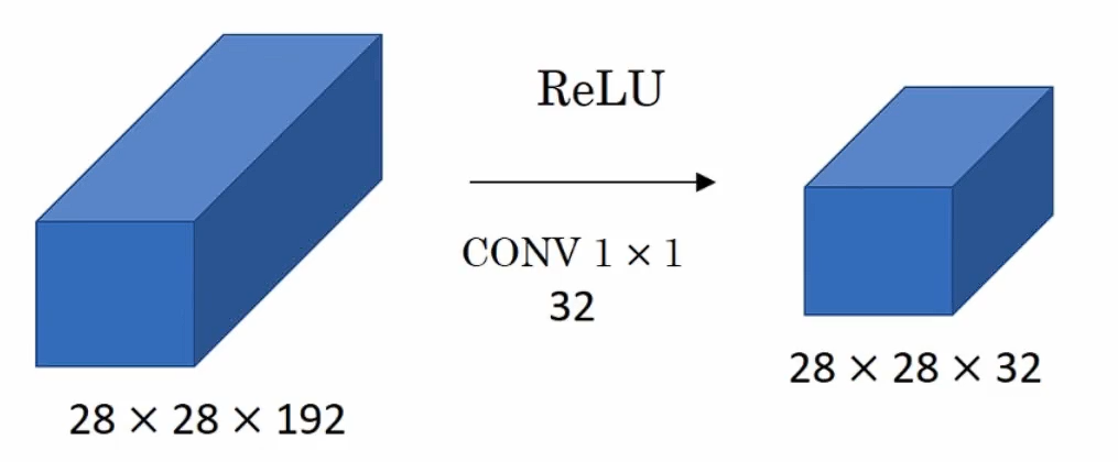 假设这是一个28×28×192的输入层,你可以使用池化层压缩它的高度和宽度,但是如果通道数量很大,那么,该如何把它压缩为28×28×32呢?你可以用32个大小为1×1×192维的过滤器。