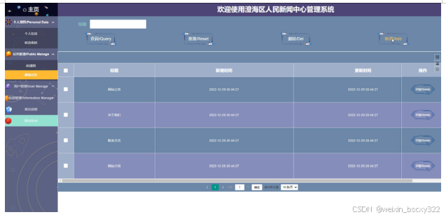 通知公告,管理员在此页面可以查看公告标题,新增时间,更新时间等信息,并可根据需要进行查询,重置,删除,新增等操作,如图5-4所示。