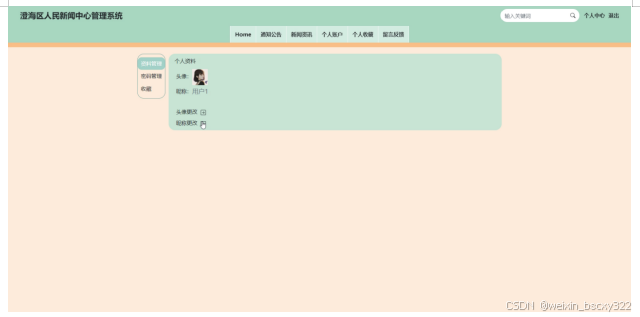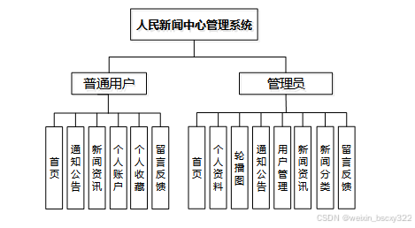 (1)功能要求:可以管理主页,个人资料,公共管理(轮播图,通知公告),用户管理(管理员,普通用户),信息管理(新闻资讯,新闻分类),留言反馈等功能模块。
