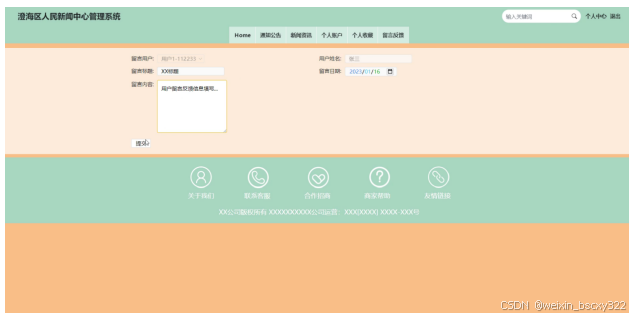 留言反馈,在此界面输入标题,详细留言内容以提交留言反馈信息,通过个人中心进入后台查看留言反馈的回复信息,如图5-15,5-16所示。