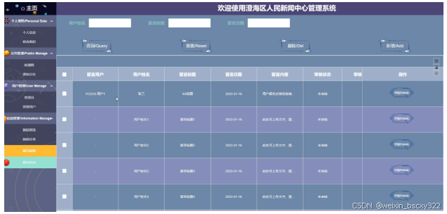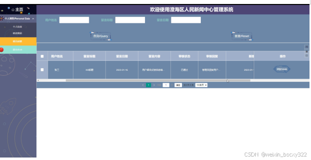 留言反馈管理,管理员在此页面可以查看留言用户,姓名,标题,日期,留言内容信息,并可根据需要进行审核回复,查询,重置,删除,新增等操作,如图5-9,5-10所示。