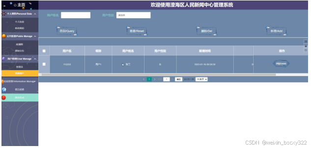 用户管理,管理员在此页面可以查看用户名,昵称,用户姓名,性别等信息,并可根据需要进行查询,重置,删除,新增等操作, 如图5-5,5-6所示。
