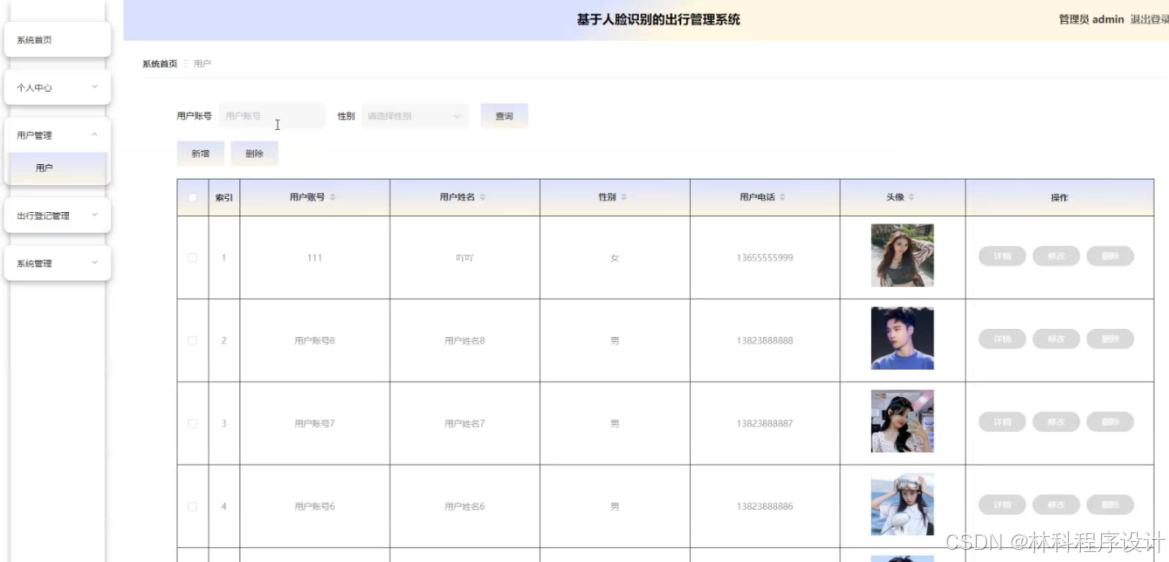 管理员点击用户管理。在用户页面输入用户账号和选择性别通过进行查询、新增或删除用户列表,并根据需要对用户详情信息进行详情、修改或删除操作;如图5-8所示: