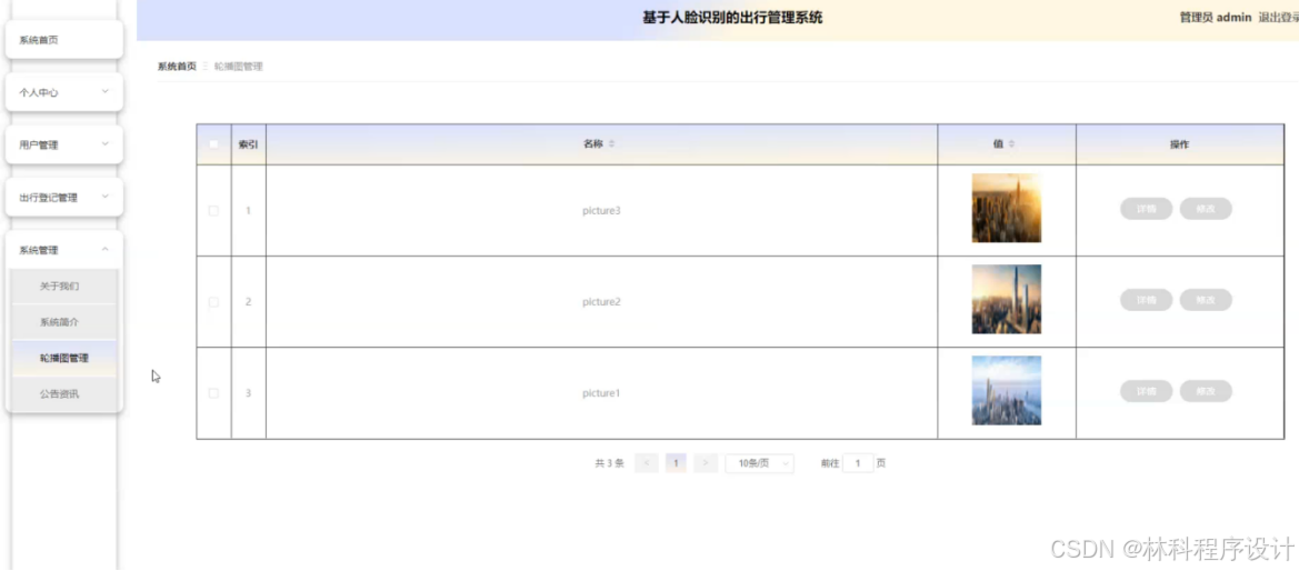 管理员点击系统管理。在轮播图管理页面可以查看索引、名称、值等详细信息,并根据需要进行详情或修改操作;还可以对关于我们、系统简介和公告资讯如图5-10所示: