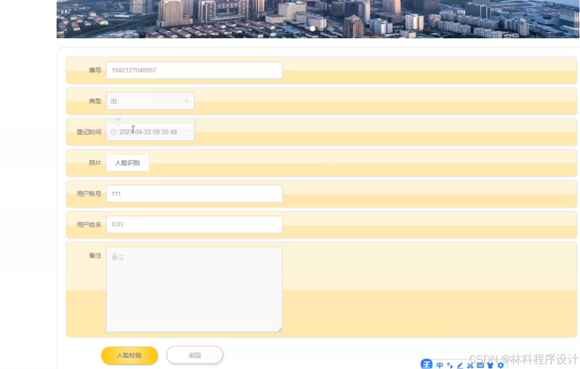 出行登记:在出行登记页面的输入栏中输入选择类型进行查询和添加,可以查看到出行登记详细信息,并根据需要进行人脸校队操作;出行登记页面如图5-3所示: