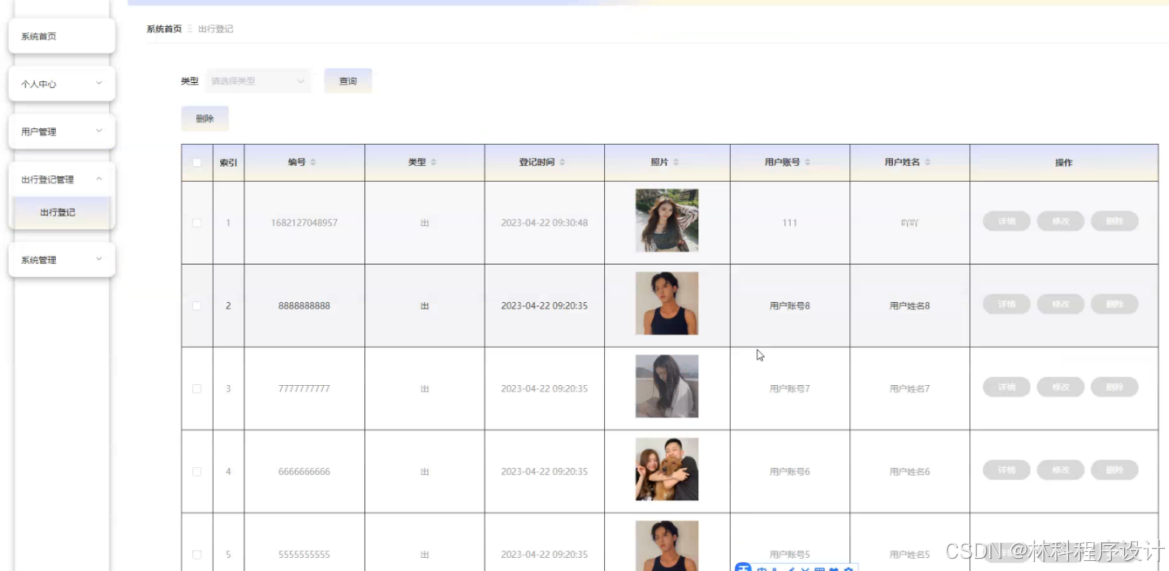 管理员点击出行登记管理。在出行登记页面输入选择类型进行查询或删除出行登记列表,并根据需要对出行登记详细信息进行详情、修改或删除操作。如图5-9所示:
