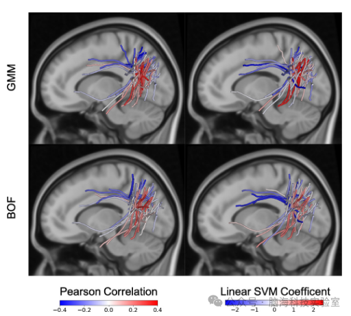 特别是,该研究中使用的线性支持向量机为每个特征分配了一个权重,该权重在图7(右)中以颜色编码。特征权重的符号表明,一个区域与相应纤维束簇之间的高相似性会增加(红色)或减少(蓝色)该区域被分类为“激活”的概率。支持向量机在预测fMRI激活的空间范围方面远远超过了随机机会。通过可视化权重来展示每个聚类在该决策中的贡献。