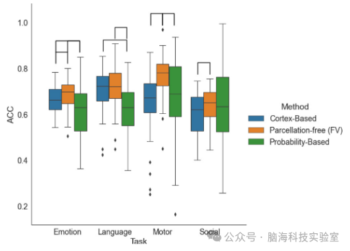 图10。将我们提出的无分组技术与基于皮质分组和基于组平均概率的替代方案所实现的准确性进行比较。箱形图显示测试对象的分布,括号表示显着差异。