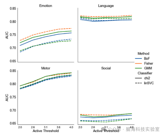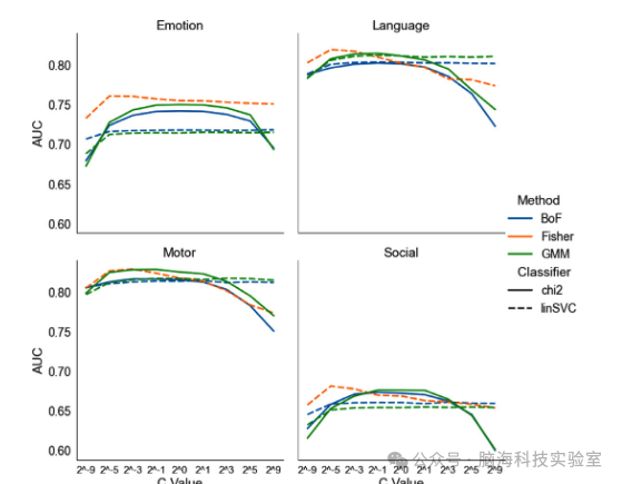 图5中的结果表明,与不同fMRI任务之间的差异相比,特征表示之间的差异较小。该研究原本预期Fisher向量表示会表现最佳,而它在所有情况下都获得了比基于词袋更高的AUC值。然而,它仅在20个子图中的8个中获得了最佳结果,并且在4个任务中的3个中与基于高斯混合模型(GMM)的特征在AUC方面打成平手(差异小于0.01)。卡方核函数始终比相应的线性支持向量机(SVM)获得更高的准确率,但有时差异很小。当同时考虑其他指标时,这种优势更为一致,使用基于GMM的特征时,在20种情况中有16种卡方核函数优于线性SVM,而基于词袋的情况只有11种。为了确保泛化能力和公平比较,第2.6节中的交叉验证会自动为每个任务、特征表示和核函数确定合适的支持向量机正则化超参数C的值。然而,图9表明,当在许多数量级范围内变化C时,该研究方法的性能保持稳定。