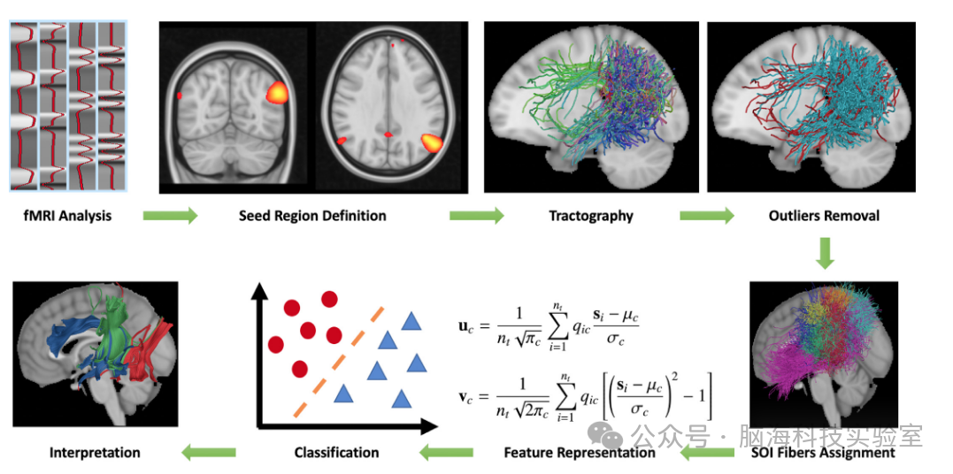 研究方法的整体流程可概括为以下步骤:数据预处理完成后,进行一级fMRI分析以检测任务与BOLD信号之间的相关性。基于分析结果,定义感兴趣超体素(SOI)并将其标记为“激活”或“非激活”。随后,通过自动种子扩散MRI纤维追踪获取SOI的连接指纹,去除异常纤维束,将单个纤维束与SOI关联,并从中计算特征空间表示。这些特征作为分类和统计检验的输入。最后,该研究描述了一种用于可视化特征及其在分类中作用的算法。